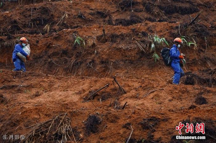 坠机事故现场下雨 工作人员铺设竹排小道